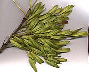 An ash can be any of four different tree genera from four very distinct families (see end of page for disambiguation), but originally and most commonly refers to trees of the genus Fraxinus (from Latin "ash tree") in the olive family Oleaceae. The ashes are usually medium to large trees, mostly deciduous though a few subtropical species are evergreen. The leaves are opposite (rarely in whorls of three), and mostly pinnately-compound, simple in a few species. The seeds, popularly known as keys, are a type of fruit known as a samara. The tree's common English name goes back to the Old English æsc, a word also routinely used in Old English documents to refer to spears made of ash wood.