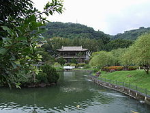 Naturalistic design of a Chinese garden incorporated into the landscape, including a pavilion