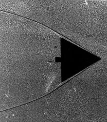 Delta wing in wind tunnel. The shadows form as the indices of refraction change within the gas as it compresses on the leading edge of this wing.