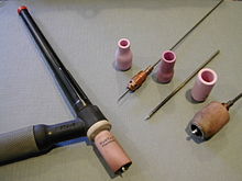 The internal metal parts of a torch are made of hard alloys of copper or brass in order to transmit current and heat effectively. The tungsten electrode must be held firmly in the centre of the torch with an appropriately sized collet, and ports around the electrode provide a constant flow of shielding gas. Collets are sized according to the diameter of the tungsten electrode they hold. The body of the torch is made of heat-resistant, insulating plastics covering the metal components, providing insulation from heat and electricity to protect the welder.