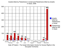 In February 2008, 2008 Israel-Gaza conflict intensified, with rockets launched at Israeli cities. Military aggression by Hamas led to Israeli military action on 1 March 2008, resulting in over 110 Palestinians being killed according to BBC News, as well as 2 Israeli soldiers. Israeli human rights group B'Tselem estimated that 45 of those killed were not involved in hostilities, and 15 were minors.