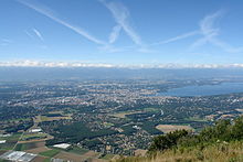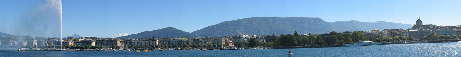 | Top left: Palace of Nations, Middle left: ATLAS experiment at CERN, Right: Jet d'Eau, Bottom: View over Geneva and the lake. | ||||||||||