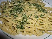 Pasta dressed with pesto sauce, a popular Genoese dish.