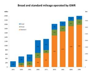 The Great Western Railway (GWR) was a British railway company that linked London with the south-west and west of England and most of Wales. It was founded in 1833, received its enabling Act of Parliament in 1835 and ran its first trains in 1838. It was engineered by Isambard Kingdom Brunel, who chose a broad gauge of 7 ft 14 in (2,140 mm) but, from 1854, a series of amalgamations saw it also operate 4 ft 8 12 in (1,435 mm) standard-gauge trains; the last broad-gauge services were operated in 1892. The GWR was the only company to keep its identity through the Railways Act 1921, which amalgamated it with the remaining independent railways within its territory, and it was finally wound up at the end of 1947 when it was nationalised and became the Western Region of British Railways.