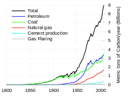Since the beginning of the Industrial Revolution, the burning of fossil fuels has contributed to a 40% increase in the concentration of carbon dioxide in the atmosphere from 280 ppm to 397 ppm, despite the uptake of a large portion of the emissions by various natural "sinks" involved in the carbon cycle. Anthropogenic carbon dioxide (CO2) emissions (i.e., emissions produced by human activities) come from combustion of carbon based fuels, principally wood, coal, oil, and natural gas.