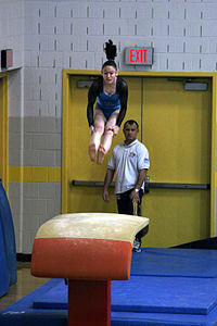 - In the vaulting events gymnasts sprint down a 25 metres (82 ft) runway, jump onto or perform a roundoff entry onto a springboard (run/ take-off segment), land momentarily, inverted on the hands on the vaulting horse or vaulting table (pre flight segment), then spring off of this platform to a two footed landing (post flight segment). Every gymnast starts at a different point on the vault runway depending on their height and strength. The post flight segment may include one or more multiple saltos or somersaults, and/or twisting movements. Round-off entry vaults are the most common vaults in elite level gymnastics. In vaults with roundoff entries, gymnasts "round-off" so hands are on the runway while the feet land on the springboard (beatboard). From the roundoff position the gymnast travels backwards as in a backhandspring so that the hands land on the vaulting platform (horse). She then blocks off the vaulting platform into various twisting and/or somersaulting combinations. The post flight segment brings the gymnast to her feet.