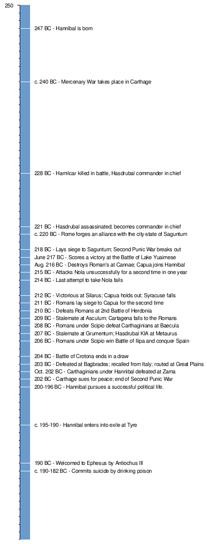 Hannibal, son of Hamilcar Barca (247 – 183/182 BC) was a Punic Carthaginian military commander, generally considered one of the greatest military commanders in history. His father, Hamilcar Barca, was the leading Carthaginian commander during the First Punic War, his younger brothers were Mago and Hasdrubal, and he was brother-in-law to Hasdrubal the Fair.