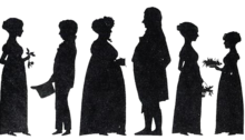 A silhouette of the Altenburg/ Paus family, members of the Skien patriciate, shortly after the Napoleonic Wars. To the right Ibsen's mother Marichen Altenburg, her parents Hedevig Christine née Paus and ship-owner Johan Andreas Altenburg in the centre, to the left of Hedevig her nephew Henrik Johan Paus, who was not only Marichen Altenburg's cousin, but also the half brother of Knud Ibsen, and who grew up with his uncle and aunt