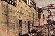 Pedro Miguel Locks under construction, early 1910s, showing centre wall and intakes, looking north.