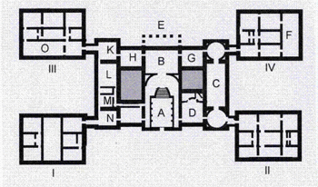 The plans for Holkham were of a large central block of two floors only, containing on the piano nobile level a series of symmetrically balanced state rooms situated around two courtyards. No hint of these courtyards is given externally; they are intendeded for lighting rather than recreation or architectural value. This great central block is flanked by four smaller, rectangular blocks, or wings, and at each corners is linked to the main house not by long colonnades—as would have been the norm in Palladian architecture—but by short two-storey wings of only one bay.