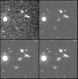 The production of a final combined image at each wavelength was a complex process. Bright pixels caused by cosmic ray impacts during exposures were removed by comparing exposures of equal length taken one after the other, and identifying pixels that were affected by cosmic rays in one exposure but not the other. Trails of space debris and artificial satellites were present in the original images, and were carefully removed.