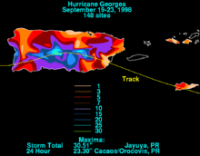 Upon making landfall, Hurricane Georges produced torrential rainfall, amounting to a maximum of 24.41 inches (620 mm) at Limonar in the province of Guantánamo. Several other locations reported over a foot (300 mm) of precipitation as well. Storm surge of 4 – 6 feet (1 – 2 m) was expected along the eastern coastline, along with dangerous waves on top of the surge. Though winds were reduced by the time Georges hit Cuba, it still retained winds of 75 mph (121 km/h), along with stronger gusts in squalls.