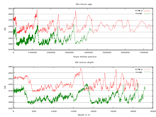 Different dating methods makes comparison and interpretation difficult. Matching peaks by visual examination of Moulton and Vostok ice cores suggests a time difference of about 10,000 years but proper interpretation requires knowing the reasons for the differences.