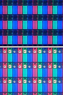 A magnified image of an LCD screen showing RGB pixels. Individual transistors are seen as white dots in the bottom part.