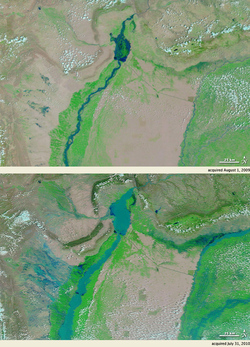 In July 2010, following abnormally heavy monsoon rains, the Indus River rose above its banks and started flooding. The rain continued for the next two months, devastating large areas of Pakistan. In Sindh, the Indus burst its banks near Sukkur on 8 August, submerging the village of Mor Khan Jatoi. In early August, the heaviest flooding moved southward along the Indus River from severely affected northern regions toward western Punjab, where at least 1,400,000 acres (570,000 ha) of cropland was destroyed, and the southern province of Sindh. As of September 2010, over two thousand people had died and over a million homes had been destroyed since the flooding began.