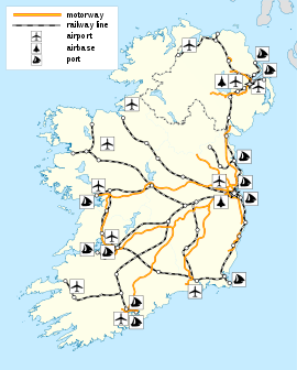 Ireland's intercity railroads, important water ports, airports (with regularly scheduled non-domestic flights), and motorways (including some motorways nearing completion).