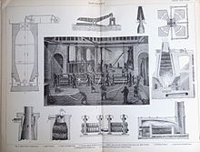 The fining process of smelting iron ore to make wrought iron from pig iron, with the right illustration displaying men working a blast furnace, from the Tiangong Kaiwu encyclopedia, published in 1637 by Song Yingxing.