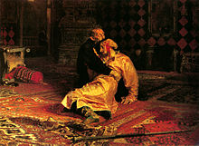 Ivan the Terrible meditating at the deathbed of his son. Ivan's murder of his son brought about the extinction of the Rurik Dynasty and the Time of Troubles. Painting by Vyacheslav Grigorievich Schwarz (1861).