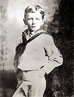 Half-length portait of a fortyish man wearing distinctive Windsor (circular-lens) glasses with black Zylo-covered frames, short and slicked-down brown hair, a small mustache, light tan jacket, and brown tie. His mouth is turned down in a slightly truculent expression