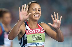 Jessica Ennis-Hill, CBE (born 28 January 1986) is a British track and field athlete specialising in multi-eventing disciplines and 100 metres hurdles. A member of the City of Sheffield Athletic Club, she is the current Olympic heptathlon champion. She is also the former European and world heptathlon champion and the former world indoor pentathlon champion. She is the current British national record holder for the heptathlon, the indoor pentathlon, the high jump and the 100 metres hurdles.
