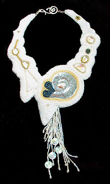 Beads are frequently used in jewellery. These may be made of glass, gemstones, metal, wood, shells, clay and polymer clay. Beaded jewellery commonly encompasses necklaces, bracelets, earrings, belts and rings. Beads may be large or small; the smallest type of beads used are known as seed beads, these are the beads used for the "woven" style of beaded jewellery. Another use of seed beads is an embroidery technique where seed beads are sewn onto fabric backings to create broad collar neck pieces and beaded bracelets. Bead embroidery, a popular type of handwork during the Victorian era, is enjoying a renaissance in modern jewellery making. Beading, or beadwork, is also very popular in many African and indigenous North American cultures.