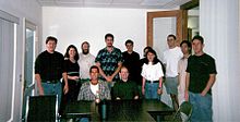 The staff of Wales' internet company Bomis photographed in Summer 2000. Wales is third from the left in the back row, with his then-wife Christine.
