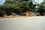 A collision with a vehicle is capable of killing a kangaroo. Kangaroos dazzled by headlights or startled by engine noise often leap in front of cars. Since kangaroos in mid-bound can reach speeds of around 50 km/h (31 mph) and are relatively heavy, the force of impact can be severe. Small vehicles may be destroyed, while larger vehicles may suffer engine damage. The risk of harm to vehicle occupants is greatly increased if the windscreen is the point of impact. As a result, "kangaroo crossing" signs are commonplace in Australia.