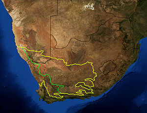 Map of the two Karoo ecoregions as delineated by the WWF. Satellite image from NASA. The yellow line encloses the two ecoregions. The green line separates the Succulent Karoo, to the west, from the Nama Karoo, to the east. National boundaries are shown in black. Note that the ecoregions given the name "Karoo" do not coincide exactly with the geographical boundaries of what is traditionally recognized as The Karoo sensu stricto. For example, nobody in southern Africa would hold that 'The Karoo' proper extends into Namibia.