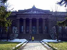 Constructed in 1898 by architect Vladislav Gorodetsky, the building was originally designed as the museum for the local society of patrons of arts and antique lovers. The façade of the building conveys a classic architecture form – precise reproduction of a six-column porch of Doric order with entablature, triglyphs, metopes and frieze decoration depicting the Triumph of Arts. The architectural composition featuring figures of gryphons and large concrete lions at the top of the stairs were created by an Italian sculptor, Emilio Sala.