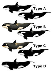 - Type A looks like a "typical" killer whale, a large, black and white form with a medium-sized white eye patch, living in open water and feeding mostly on minke whales.