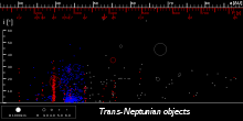Distribution of cubewanos (blue), Resonant trans-Neptunian objects (red) and near scattered objects (grey).