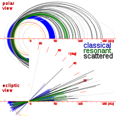 Comparison of the orbits of scattered disc objects (black), classical KBOs (blue), and 2:5 resonant objects (green). Orbits of other KBOs are gray.