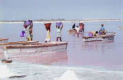 It is so named for its pink waters, caused by cyanobacteria in the water. The colour is particularly visible during the dry season. The lake is also known for its high salt content, which, like that of the Dead Sea, allows people to float easily. The lake also has a small salt collecting industry and is often the finishing point of the Dakar Rally.