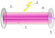A helium-neon laser demonstration at the Kastler-Brossel Laboratory at Univ. Paris 6. The glowing ray in the middle is an electric discharge producing light in much the same way as a neon light. It is the gain medium through which the laser passes, not the laser beam itself, which is visible there. The laser beam crosses the air and marks a red point on the screen to the right.