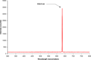 Spectrum of a helium neon laser showing the very high spectral purity intrinsic to nearly all lasers. Compare with the relatively broad spectral emittance of a light emitting diode.
