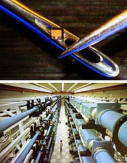 Lasers range in size from microscopic diode lasers (top) with numerous applications, to football field sized neodymium glass lasers (bottom) used for inertial confinement fusion, nuclear weapons research and other high energy density physics experiments.