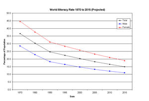 Graph of declining illiteracy rates world-wide from 1970 to 2015