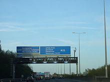 Data from driver location signs provide carriageway identifier information. The numbers on the signs are kilometres from a point near the River Thames, east of London, when travelling clockwise on the motorway. The table below gives details of each junction, including the roads interchanged and the destinations that are signed from the motorway. Figures in kilometres are from the driver location signs; figures in miles are derived from them.
