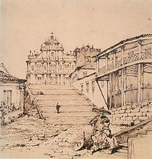 Ruins of St. Paul's Cathedral, by George Chinnery (1774–1852). The cathedral was built in 1602 and destroyed by fire in 1835. Only the southern stone façade remains today.