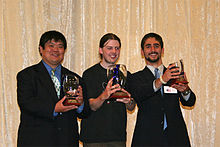 The winners of the second Open European Mahjong Championship, Copenhagen, Denmark, June 2007. From left: Kohichi Oda (2), Martin Wedel Jacobsen (1), and Benjamin Boas (3)