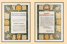 Several works of art bear her likeness, or are dedicated to her. Michalina Mościcka, wife of Polish President Ignacy Mościcki, unveiled a 1935 statue of Marie Curie before Warsaw's Radium Institute. During the 1944 Second World War Warsaw Uprising against the Nazi German occupation, the monument was damaged by gunfire; after the war it was decided to leave the bullet marks on the statue and its pedestal. In 1955 Jozef Mazur created a stained glass panel of her, the Maria Skłodowska-Curie Medallion, featured in the University at Buffalo Polish Room.