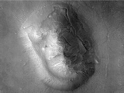 Image of Phoenix landing on Mars, as seen by HiRISE. Although in the image it appears to be descending into the crater, Phoenix actually landed 20 km away from it.