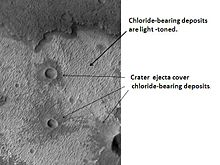 Using data from Mars Global surveyor, Mars Odyssey and the Mars Reconnaissance Orbiter, scientists have found widespread deposits of chloride minerals. Evidence suggests that the deposits were formed from the evaporation of mineral enriched waters. The research suggests that lakes may have been scattered over large areas of the Martian surface. Usually chlorides are the last minerals to come out of solution. Carbonates, sulfates, and silica should precipitate out ahead of them. Sulfates and silica have been found by the Mars Rovers on the surface. Places with chloride minerals may have once held various life forms. Furthermore, such areas could preserve traces of ancient life.