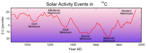 The lower solar activity during the Maunder Minimum also affected the amount of cosmic radiation reaching the Earth. The resulting change in the production of carbon-14 during that period caused an inaccuracy in radiocarbon dating until this effect was discovered.