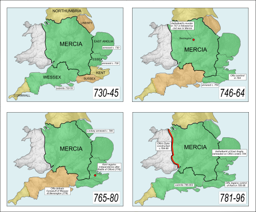 A series of maps that illustrate the increasing hegemony of Mercia during the 8th century