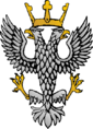 The silver double-headed eagle surmounted by a golden three-pronged Saxon crown has been used by several units of the British Army as a heraldic device for Mercia since 1958. It is derived from the attributed arms of Leofric, Earl of Mercia in the 11th century. It is worth noting, however, that Leofric is sometimes attributed a black, single-headed eagle instead. The examples on the left are the official devices of the Mercian Regiment and the Royal Mercian and Lancastrian Yeomanry respectively. The latter, being a merged unit, also sports the Lancastrian red rose and crown.