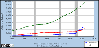 The money supply of a country is usually held to be the total amount of currency in circulation plus the total amount of checking and savings deposits in the commercial banks in the country. In modern economies, relatively little of the money supply is in physical currency. For example, in December 2010 in the U.S., of the $8853.4 billion in broad money supply (M2), only $915.7 billion (about 10%) consisted of physical coins and paper money.