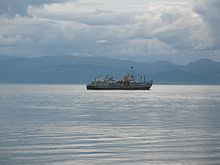 Mongolian ferry Sukhbaatar on Lake Khovsgol in Khovsgol Province.