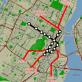 In 1953 the newly formed Montreal Transportation Commission proposed a single line, running under Rue Sainte Catherine from Rue Atwater towards Peel where the line would have turned south, going underneath Square Dorchester all the way down to Rue Saint-Jacques, which it followed to Rue Saint-Denis. Then, it would have gone north all the way to Boulevard Crémazie, right by the D'Youville maintenance shops.