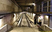| Track gauge | 1,435 mm (4 ft 8 1⁄2 in) standard gauge with running pads for the rubber tired wheels outside of the steel rails |